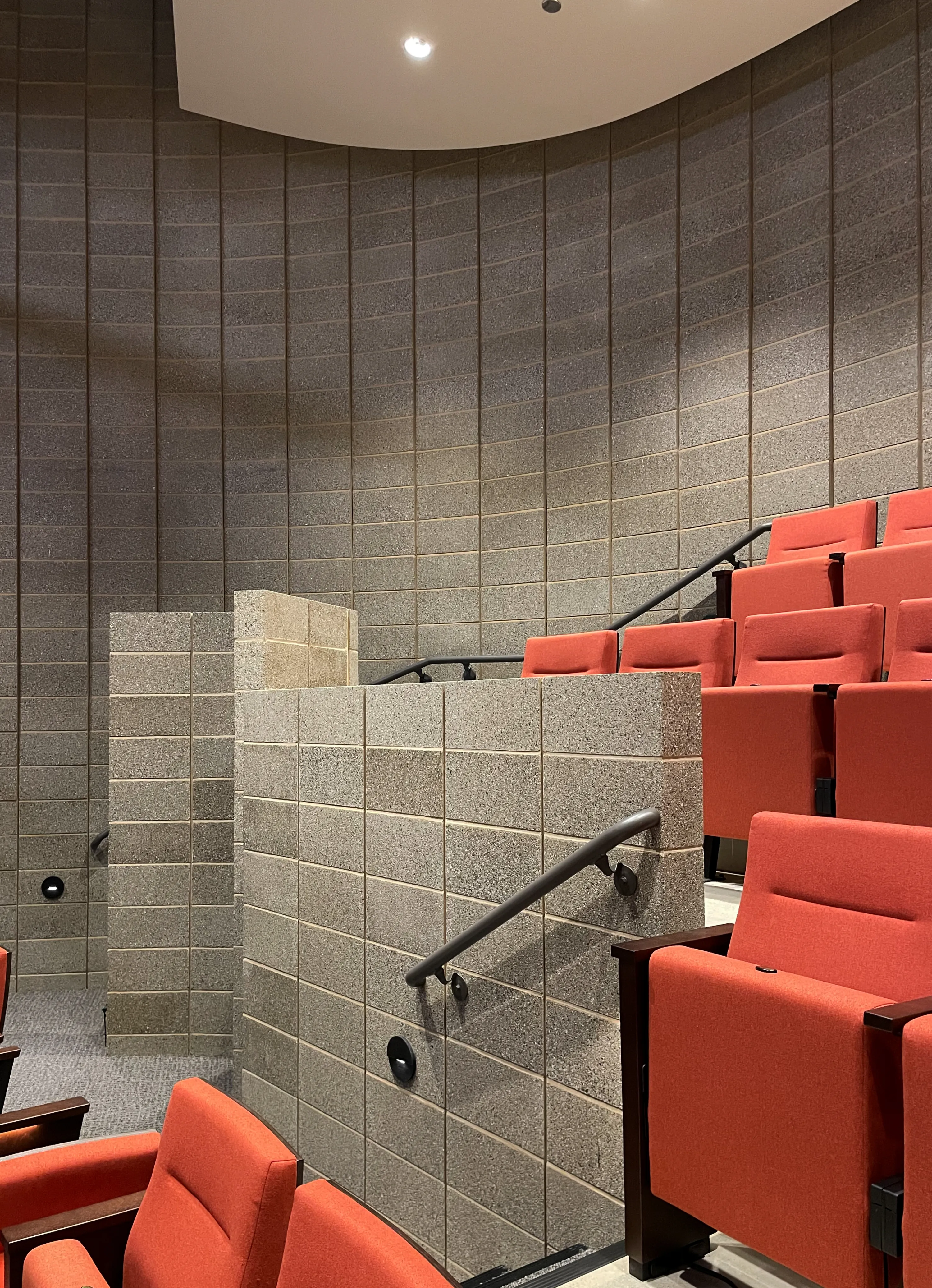 The block is designed as part of a system of parts working together in service of the young and developing voices of the students. Ground-face CMU was used as the single interior material of the theater shell, providing durability and longevity by minimizing maintenance requirements. The softly curved CMU shell is created from a field of block, each rotating unique to its; spatial coordinates to create a framework for dispersing sound within the theater without the need for additional applied materials. Acoustical models, mock-ups and field coordination helped the team achieve the best design and construction of this unique wall.