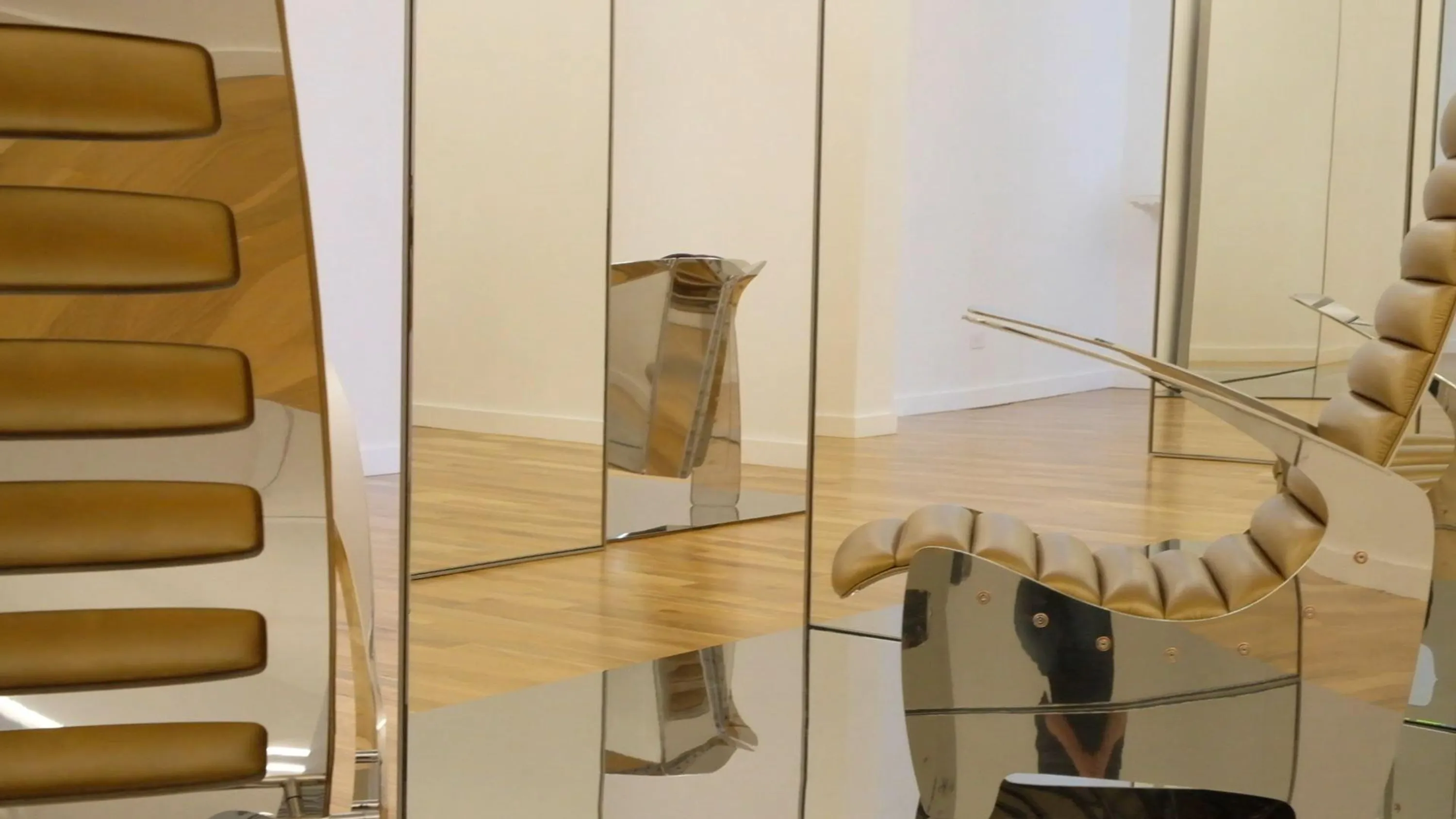 Each piece of furniture in Reflections is an elegant expression of form, proportion, and sensuous materials. The structures are highly reflective appearing to lighten the mass of the design. The byproduct of reflectivity is that it absorbs and becomes part of the environment it is placed. It is an object at one moment and folds into space the next. The reflective stainless steel enables an expression of fluidity in form. Paradoxically, each organically inspired piece appears to be a celebration of industrial design, while in reality they are all meticulously handmade.